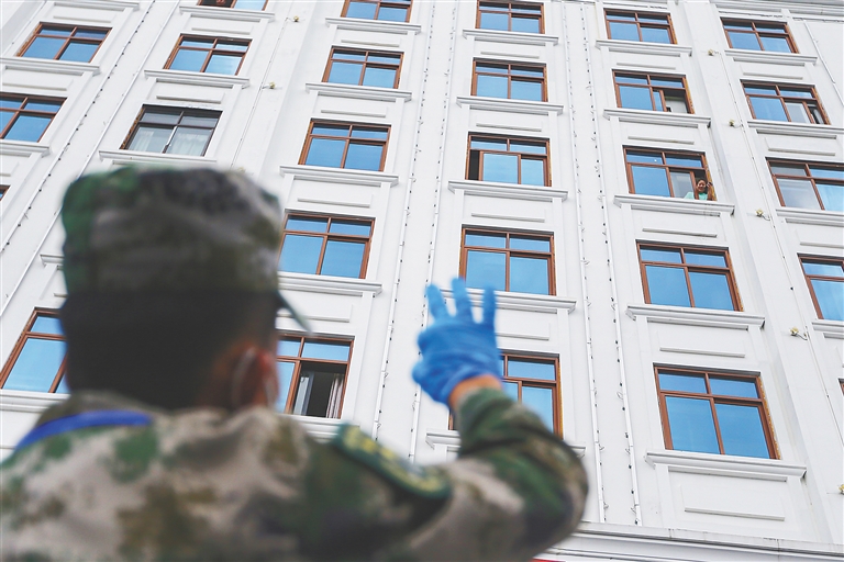 ④8月11日,在三亚市天涯区群众街社区,民兵与楼上居民对喊核对订单信息。