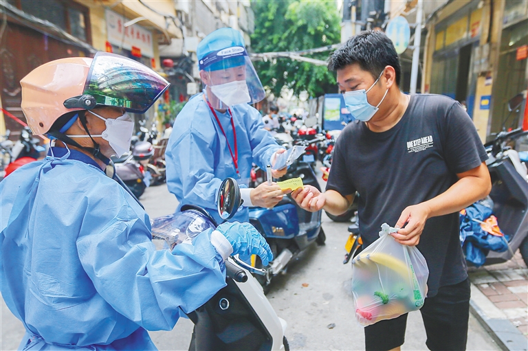 ①8月11日,在三亚市天涯区群众街社区敬群巷,社区工作人员将蔬菜包送给居民。