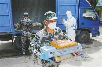 ③8月11日,民兵程贤双为三亚市天涯区群众街社区的居民送去生活物资。