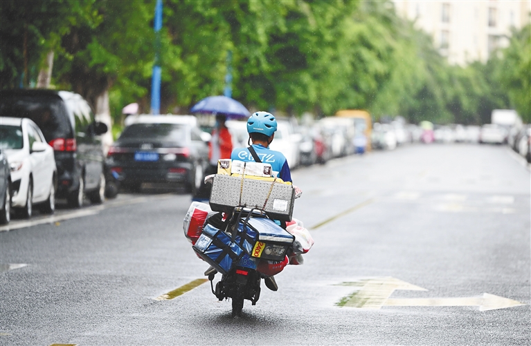 ②8月12日,海口市的快递小哥骑着电动车穿梭于街头巷尾,为居民送去急需的生活物资。