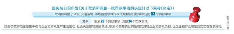 新华社北京8月12日电 为进一步推进“放管服”改革、优化营商环境,国务院日前印发《关于取消和调整一批罚款事项的决定》,取消和调整了公安、交通运输、市场监管领域行政法规和部门规章设定的53个罚款事项,其中,取消29个罚款事项,调整24个罚款事项。这些罚款事项主要集中在与企业和群众生产生活密切、社会关注度较高的领域,取消和调整的目的是切实减轻企业和群众负担,让企业和群众感受到实实在在的好处。《决定》明确了这些罚款事项的名称、设定依据、处理决定和替代监管措施。