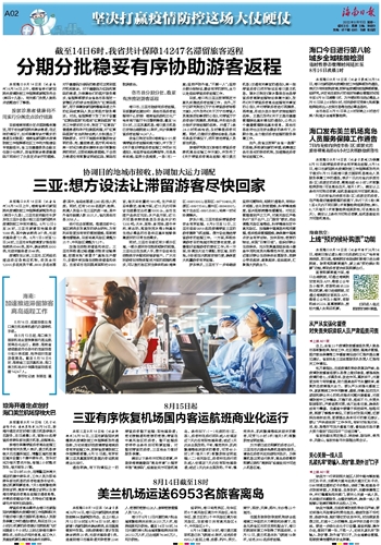 本报三亚8月14日电 (记者李艳玫)8月14日,三亚市新型冠状病毒肺炎疫情防控工作指挥部发布通告称,为切实做好因疫情滞留海南旅客有序返程工作,按照省疫情防控工作指挥部部署,8月15日起,有序恢复三亚凤凰国际机场国内客运航班商业化运行。