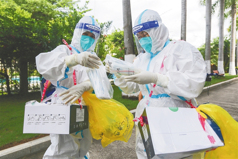 8月14日一早,三亚崖州区南滨居,曾在部队服役8年的志愿者马伟哲叫醒同样来自省财政厅的战友杨东柏、蒋鹏,开始为支援南滨居社区上门摸排等防疫工作做准备。