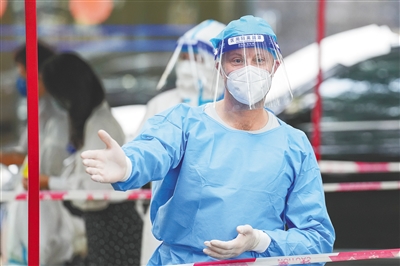 ② 近日,在三亚吉阳区干沟村3号核酸采样点,志愿者伊恩正引导大家保持好距离,戴好口罩进行核酸检测。伊恩来自英国,已经在三亚生活15年。本报记者 武威 摄