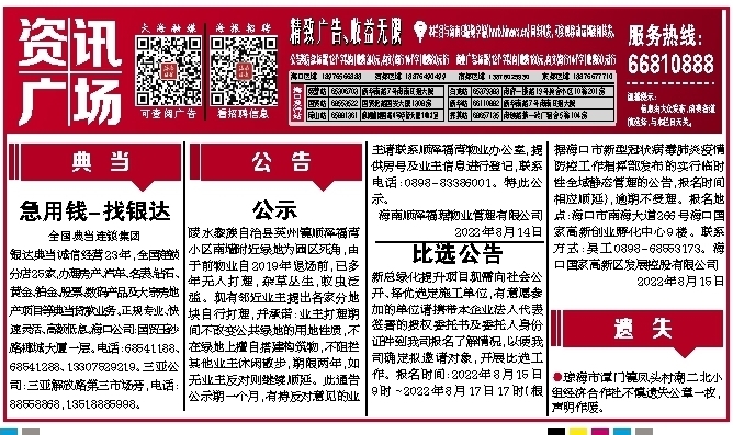 银达典当诚信经营23年,全国连锁分店25家,办理房产、汽车、名表、钻石、黄金、铂金、股票、数码产品及大宗房地产项目等典当贷款业务。正规专业、快速灵活、高额低息。海口公司:国贸玉沙路椰城大厦一层。电话:68541188、68541288、13307529219。三亚公司:三亚解放路第三市场旁,电话:88558868,13518885998。