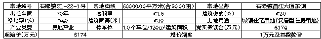 该地块安置补偿落实到位,土地权利清晰;不存在土壤污染,符合土壤环境质量要求;确认通水、通电、通路等,完成土地平整,具备动工开发必需的条件;已完成地上附着物清表,地上附着物已补偿到位,无法律经济纠纷。二、本次挂牌出让设有底价,按照出价最高且不低于底价者得的原则确定竞得人。三、房屋销售及开发建设要求:(一)根据县住建局《关于出具石碌镇SL-22-1号地块相关信息及土地出让相关联条件的复函》(昌住建函〔2022〕176号)及县发改委《关于出具石碌镇SL-22-1号地块土地出让相关联条件的复函》,本项目房屋销售等相关条件要求如下:1.购房对象:本县户籍居民家庭或者引进人才,同时符合《海南自由贸易港安居房建设和管理若干规定》要求的家庭。2.房屋销售价格限定:本项目开发完成后,安居房销售均价为6700元/平方米。以上要求最终由县住建局及县发改委审核确定。(二)开发建设要求:1.本次挂牌出让国有建设用地已具备开发建设条件。竞得人应在按现状交地后2个月内开工建设,自开工之日起两年内竣工。涉及土地闲置处置问题按照《海南自由贸易港闲置土地处置若干规定》有关规定执行。2.竞得人须按《海南省产业项目发展和用地准入协议》的要求,投资强度不得低于每亩250万元标准进行开发建设,年度产值、年度税收、准入、其他条件不作具体要求,达产时间为签订《国有土地使用权出让合同》后2年半内。3.装配式建造要求:社会投资项目的总建筑面积10万平方米以上的新建商品住宅项目和2020年及以后取得工程规划许可证的总建筑面积超过3万平方米或单体超过2万平方米的新建社会投资公共建筑,单体建筑2000平方米以上的新建工业建筑项目,具备条件的应采用装配式建造,装配式建筑项目原则上应采用工程总承包(EPC)模式。四、竞买申请人需具备的条件:(一)中华人民共和国境内外的法人、自然人和其他组织均可申请参加,申请人应当单独申请。属境外机构和个人(含港、澳、台地区)申请参与竞买的,按照规定需提交相关主管部门核发的《外商投资企业批准证书》和《营业执照》。(二)申请人拟成立项目公司或全资子公司进行开发建设的,应在竞买申请书中明确项目公司或全资子公司的出资构成、成立时间等内容,申请人在项目公司出资比例不得低于50%(不含50%),由项目公司或全资子公司与我局签订《国有建设用地使用权出让合同》,办理土地使用权登记手续。(三)有下列情形之一的申请人,不得参与本次竞买:1.凡在海南省范围内有严重违反土地出让合同、闲置土地、拖欠地价或有其他不良记录的,及与其有参股、控股、投资关系的法人及其他组织。2.失信被执行人。(四)地块产业准入条件:房地产业。五、报名方式:(一)交易资料获取方式:本次挂牌出让的详细信息和具体要求,见挂牌出让手册及其他相关文件。手册和文件可从海南省建设用地使用权和矿业权网上交易系统(以下简称网上交易系统,网址:http://lr.hainan.gov.cn:9002)查看和打印。(二)竞买申请方式:本次交易活动竞买申请环节采取线上方式进行,有意向的竞买人可登录网上交易系统提交竞买申请,按要求上传竞买申请文件。不接受电话、邮寄、书面、口头等其他形式的申请。竞买申请时间:2022年8月15日8时30分至2022年9月12日17时00分(以网上交易系统服务器时间为准,下同)。(三)竞买保证金:竞买人在网上交易系统提交竞买申请时,应选定一家银行交纳竞买保证金,选定银行后系统自动生成唯一的随机竞买保证金账号,保证金交纳银行一经选定不能更改,竞买人应谨慎选择。竞买人须按照出让手册的有关规定将竞买保证金足额交入该账号(竞买保证金到账时间以银行信息系统入账时间为准)。本次竞买保证金的币种为人民币,不接受外币。竞买保证金应不属于银行贷款、股东借款、转贷和募集资金所得,并出具承诺。竞买保证金到账截止时间为:2022年9月12日17时00分。(四)资格确认:1.竞买资格审核开始后,出让人在2个工作日内、资格审核截止时间前完成竞买申请文件审核。竞买人提交竞买申请时应充分考虑网上交易活动的竞买资格审核时效,并进行审慎注意。2.竞买人的竞买申请文件审核通过,且竞买保证金已按要求交纳的,网上交易系统自动发放《竞买资格确认书》,确认其获得竞买资格。3.竞买资格审核时间:2022年8月15日8时30分至2022年9月12日17时30分。六、挂牌报价时间及地点:(一)本次交易活动挂牌报价竞价环节采取线下方式进行,获得竞买资格的竞买人应持在线下载打印的《竞买资格确认书》到指定地点参与报价竞价活动。挂牌报价阶段仅接受书面报价,不接受电话、邮寄、电子、口头等其他方式报价。挂牌截止由挂牌主持人主持确定。(二)挂牌报价时间:2022年9月4日8时30分至2022年9月14日16时00分,受理报价时间为北京时间工作日08时30分至11时30分及14时30分至17时00分。(三)挂牌报价地点:昌江黎族自治县自然资源和规划局五楼土地储备整理交易中心。(四)挂牌现场会地点:海南省公共资源交易服务中心二楼土地矿产资源交易厅(203室)。七、风险提示:(一)浏览器请使用IE11,其他浏览器可能会对网上交易操作有影响,竞买人在竞买前仔细检查自己电脑和网络运行环境。网上竞买申请、资格审核程序按网上交易系统预先设定的程序运行,竞买人应先到网上交易模拟系统练习,熟悉网