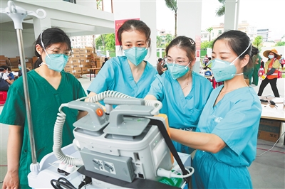 8月16日,上海援琼医疗队接管三亚市第四方舱医院。图为医务人员在准备医疗设备。