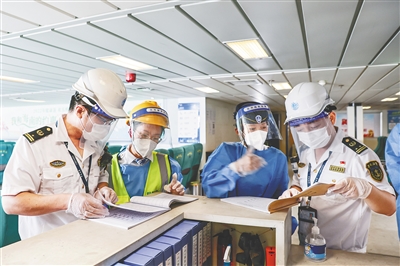 ① 8月16日,海口海事局的工作人员在海口新海港的船舶上检查防疫措施执行情况。新华社发
