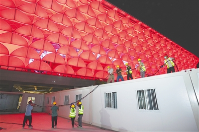 ② 8月16日,在三亚市第四方舱医院,工程人员正在紧张进行收尾工作。文/图 本报记者 李梦楠 武威