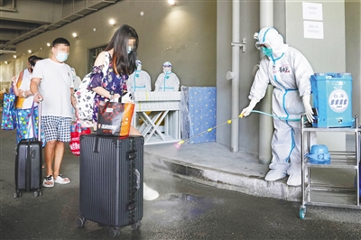 8月21日,在三亚第三方舱医院,医护人员为出院患者消杀随身物品。本报记者 武威 摄