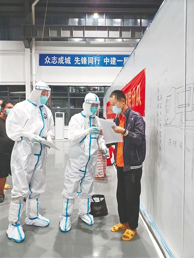 8月21日,在儋州二号方舱医院,医护人员仔细核对出院患者信息。江苏援琼医疗队方舱队供图