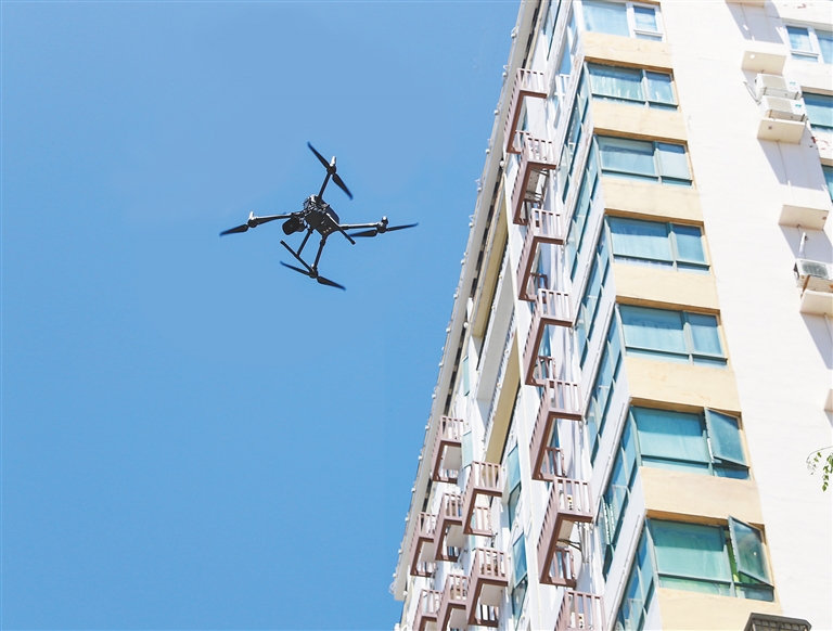 八月二十一日,在三亚红旗街社区,民警用无人机提醒居民安心居家,做好防护。见习记者 王程龙 摄