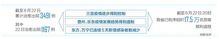 本报海口8月23日讯(记者马珂)8月23日,我省召开新冠肺炎疫情防控工作指挥部新闻发布会(第五十八场)。据悉,全省新增报告感染者数连续5天下降,疫情防控形势稳中向好,并得到进一步巩固,多个涉疫市县已实现社会面清零。截至8月22日,累计治愈出院3491例,其中22日治愈出院1167例。