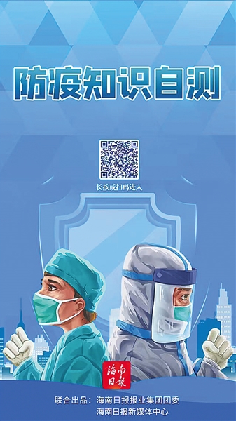 当前,海南全省疫情已出现拐点,每日新增感染者数量呈现下降趋势,疫情形势总体可控、稳中向好。但疫情防控之弦不能放松,由海南日报报业集团团委、海南日报新媒体中心联合出品的新媒体产品“防疫知识自测”正式上线,集合第九版新冠肺炎防控方案等,各类实用防疫科普小知识,赶紧来答题自测吧。