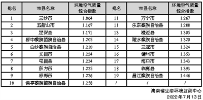 环境空气质量排名靠前的市县分别是三沙市、五指山市和定安县,排名靠后的市县分别是昌江黎族自治县、临高县和海口市。2022年6月全省19个市县环境空气质量排名如右: