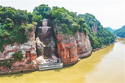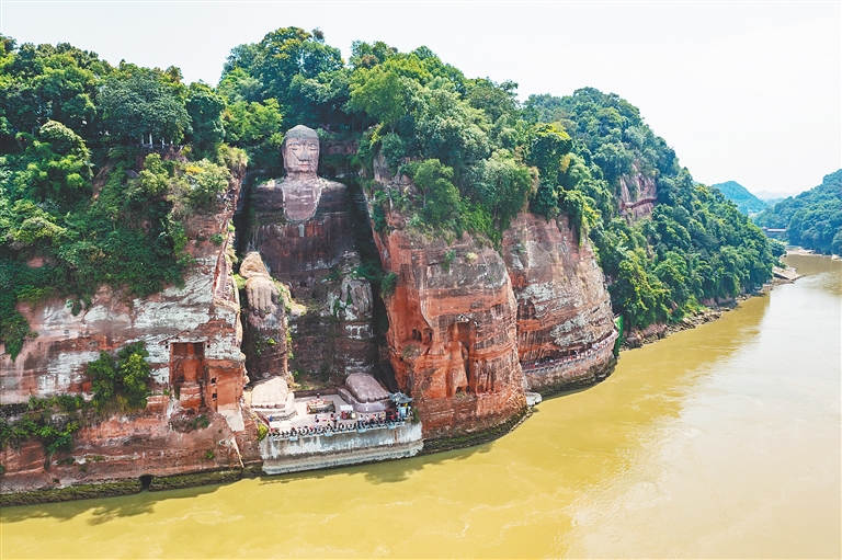 这是8月23日拍摄的露出底座的乐山大佛。近期,持续高温晴热天气使四川省多地出现不同程度的旱情,长江上游的主要支流岷江、青衣江和大渡河三条水系的上游来水均少于往年同期,导致乐山大佛前方的三江汇流处水位持续降低,部分河床与江滩裸露,乐山大佛罕见露出底座。新华社发