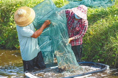 8月23日,在万宁市东澳镇龙保村,养殖户李吉娥在自家虾塘里捕捞装虾。受疫情影响,李吉娥养殖的3000斤对虾滞销,通过海南12345热线平台求助后,当地政府协调神州半岛多家物业企业前往采购,解决活虾销路的同时保障了当地鲜活农产品供应。本报记者 袁琛 摄
