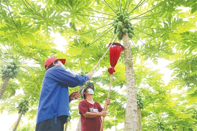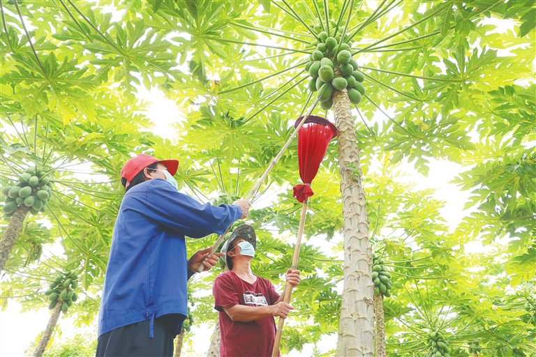 8月24日,乐东黎族自治县大安镇木棉村农户在采摘木瓜。这些木瓜将被运至海口,销往全国各地。据悉,该县农业农村局在抓好疫情防控的同时,为农产品运输车辆办理重点物资车辆通行证,打通农产品上市的运输渠道,确保农产品上市。本轮疫情发生以来,该局已经办理130多份重点物资车辆通行证,运输的农产品包括虾苗、生猪、香蕉、火龙果、木瓜等。文/见习记者 苏杰德 本报记者 曾毓慧 图/本报记者 韦茂金