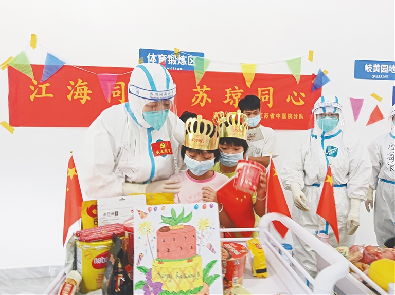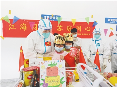 “祝你生日快乐,祝你生日快乐……”8月23日下午,一首清唱的《生日快乐歌》在儋州二号方舱医院D舱内响起。这是江苏援琼医疗队方舱队为方舱内6名小朋友举办的集体生日会。