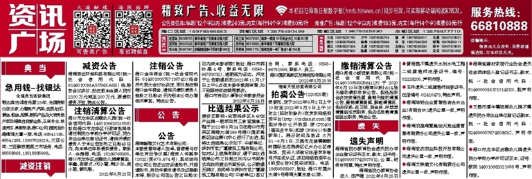 受委托,定于2022年9月2日上午10时至2022年9月3日上午10时止(延时的除外)在京东网络拍卖平台(http://zichan.jd.com)按现状净价公开拍卖:琼C7K403(福田皮卡车)和琼CF9561(华泰轿车)。展示时间及地点:8月31~9月1日;文昌市龙楼镇铜鼓岭国际生态旅游区亿兴办公区停车场。竞买人须登记注册京东账号并实名认证,详见网络拍卖平台《拍卖公告》《竞买须知》。电话:18689568397;地址:海口市国兴大道5号海南大厦主楼41层。