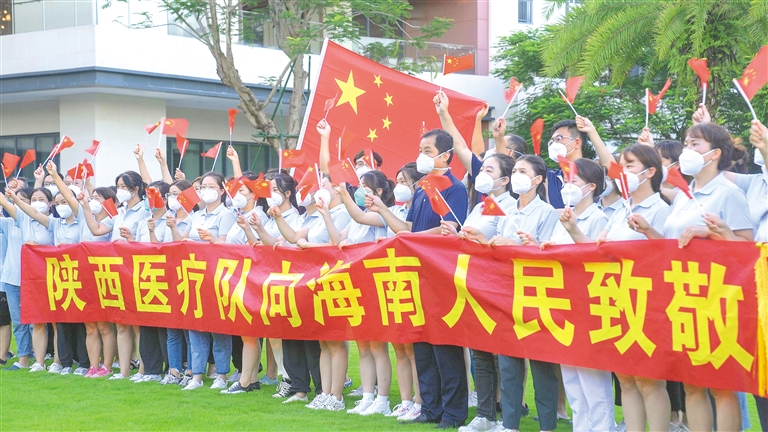 8月28日,在万宁市东澳镇,陕西医疗队在顺利完成支援海南医疗任务后向海南人民致敬,他们将搭乘8月29日的航班返程。随着海南全省疫情下降趋势明显,援琼医疗人员在完成支援任务后开始陆续返程。本报记者 袁琛 摄