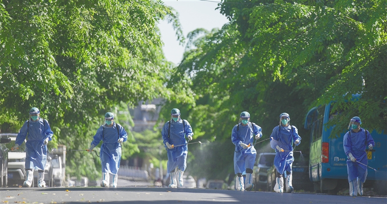 8月28日,万宁礼纪镇,广东援琼消杀队在辖区内各个街道开展消杀工作。这是一支由深圳18家专业消杀公司、共计82人组成的消杀队,于8月24日晚驰援万宁。本报记者 袁琛 摄