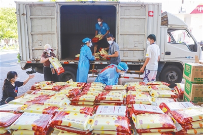 八月二十七日,在三亚市机场路社区,社区工作人员和志愿者搬运政府“爱心包”,准备送到居民家门口。 见习记者 王程龙 摄