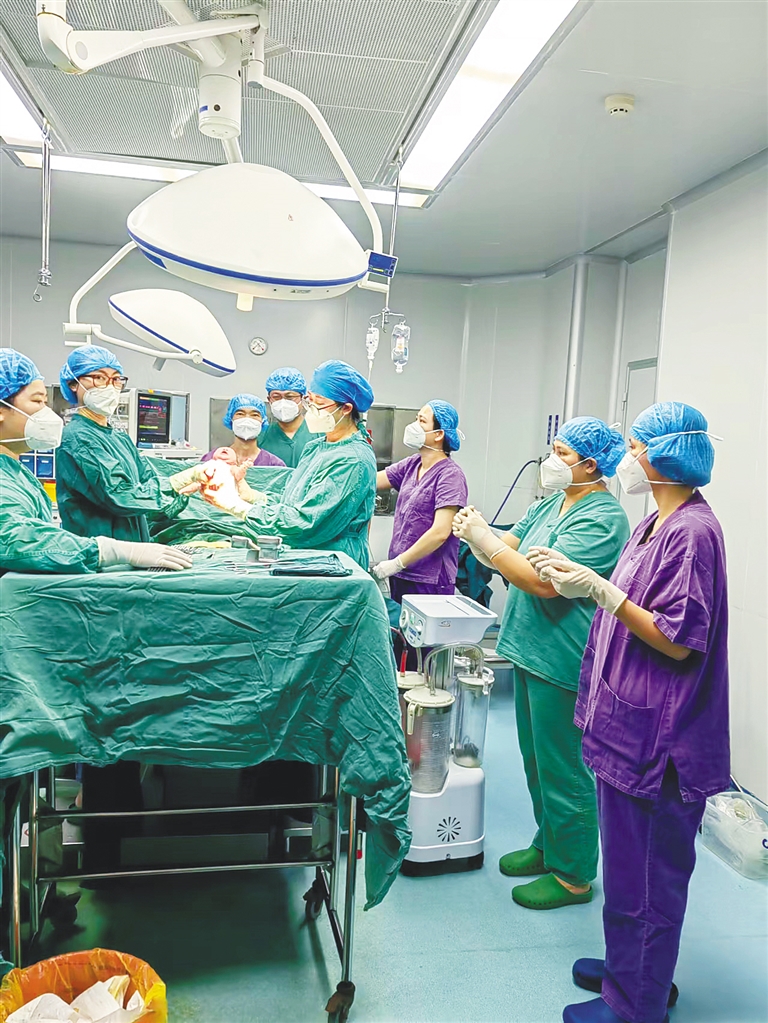 在完成一切术前准备后,6点13分,手术开始。该剖宫产手术由王霞主刀,医师王凡、麻醉医师陈礼俊、护士长许婉欣紧密配合。6点20分,伴随着一声婴儿啼哭,在场所有人提到嗓子眼的心终于放下了。“那一瞬间,心中是满满的感动。”王霞说。(文\海南日报记者 王迎春)