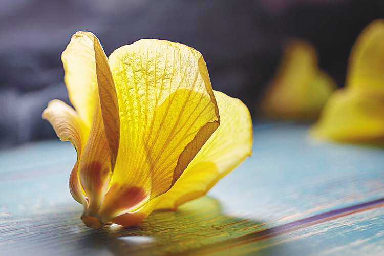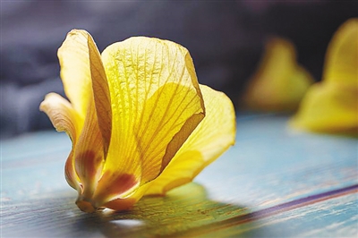 但黄槿花凋零时,并没有颓败的样貌。它花瓣上细微的绒毛、清晰的脉络,甚至是花朵的形状与张力,都和在树上时没有过多的区别。它就像一个终将远行的人,只是时候到了,要离开枝头了。但离去时仍要保持姣好的容颜。