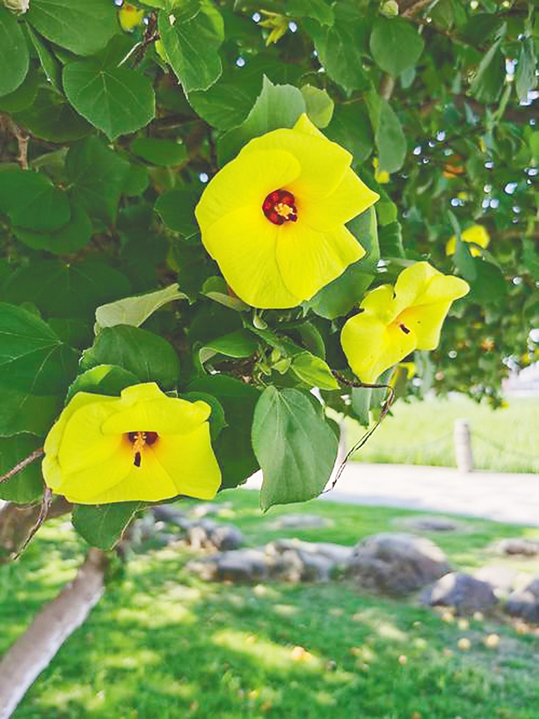 在万木竞秀的自然间,黄槿是那样普通。普通到如果不开花,不刻意寻找的话都很难注意到它。可是如果开了花,那又是另外一番景象。