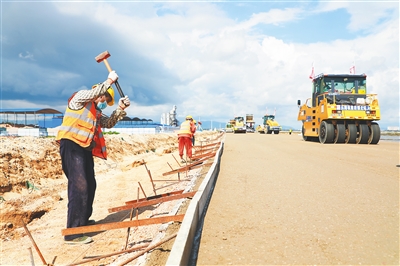 9月1日,海南环岛旅游公路项目乐东段,工人在加固并调整基层模板顺直度。环岛旅游公路作为省重点项目,受疫情影响,项目方坚持闭环管理,想方设法推进工程进度,保质保量完成建设任务。