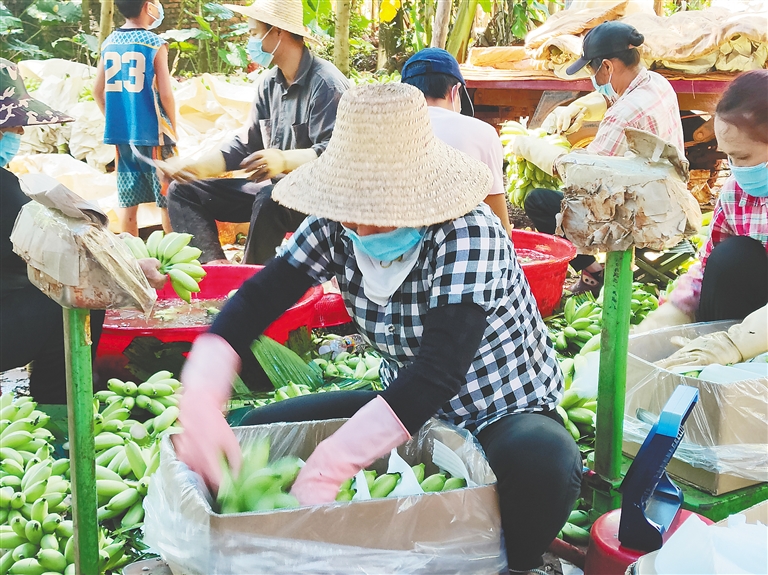 “口罩要戴好,大家再坚持一下,收完这批香蕉就收工,安全过来平安回家。”8月31日,澄迈县金江镇京岭村的香蕉收购点上,澄迈澄供乐农电子商务有限公司负责人杨聪一边检查香蕉的打包情况,一边举着大喇叭提醒大家。