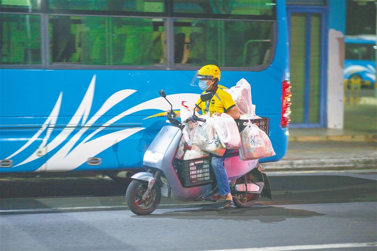 在万宁万城镇,一外卖骑手在为市民配送保供物资。