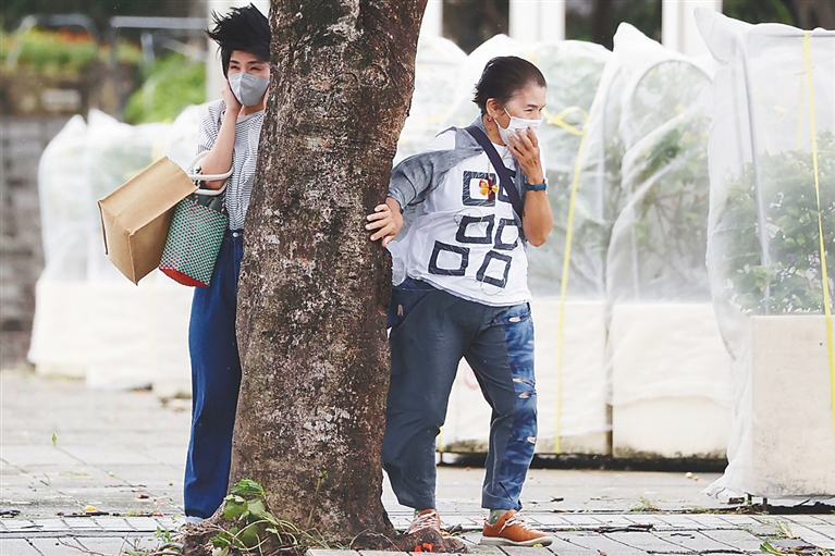 图为9月4日,在日本冲绳县那霸,行人在风中扶着树木。新华社/美联