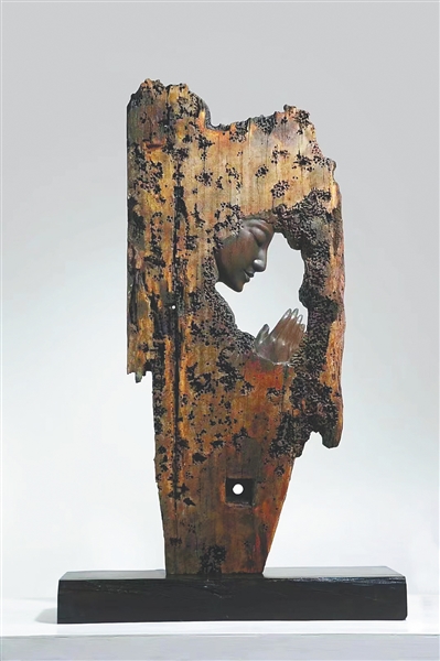 扁扁的船木中间,吴孔德刻画出人物侧脸,线条灵动。人物双手合十,闭眼的神态令人心中感到片刻宁静。作品《独思》体现的正是深林独坐的境界,镂空船木透过的光线,好似一轮明月,照耀映衬出独思的深邃和悠远。