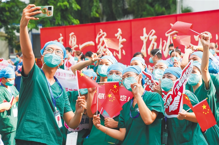 9月5日下午,三亚中心医院为广东援琼医疗队举行欢送仪式。该医疗队是第一支到达三亚的外省医疗队,整建制接管了三亚第一方舱医院。截至9月5日,三亚第一方舱医院收治患者4257人,累计出院患者3025人。当日下午5时该院正式交接给海南医学院第一附属医院医疗队。图/本报记者 武威 文/本报记者 李艳玫