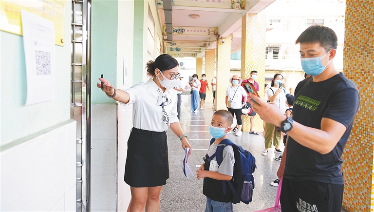 9月5日,海口市琼山第三小学,一年级学生在家长的带领下到校入学。本报记者 张茂 摄