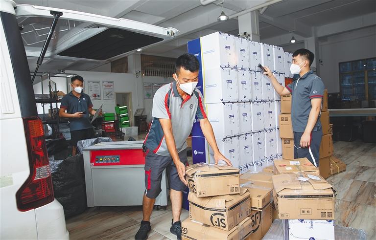 近日,在顺丰快递海口汇水湾网点,快递员正准备将快递件装车派送。