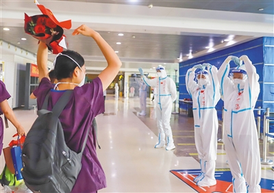 9月5日,在三亚凤凰国际机场,河南援琼医疗队员在返程前,与机场执勤人员互相“比心”。 见习记者 王程龙 摄