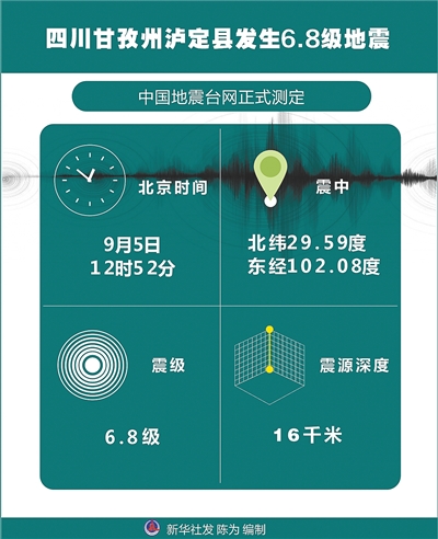 新华社成都9月5日电 (记者张海磊)据中国地震台网正式测定,9月5日12时52分在四川甘孜州泸定县(北纬29.59度,东经102.8度)发生6.8级地震,震源深度16千米。