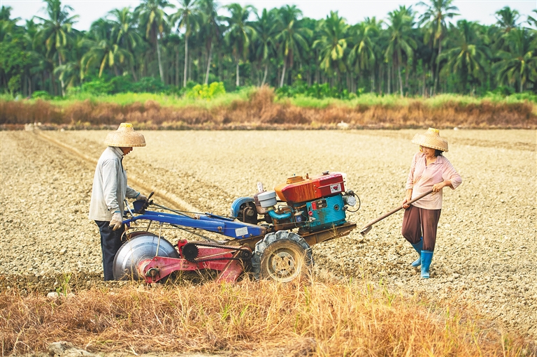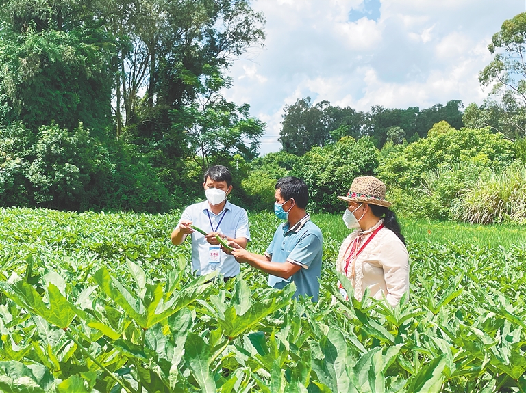 ④ 在儋州赤坎村,儋州农业农村局工作人员和收购商查看待售农产品长势。见习记者 曹马志 摄