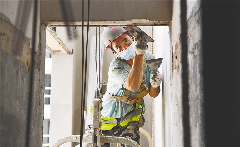 ① 工人在海口江东新区东寨新居一期项目施工现场作业。新华社记者 杨冠宇 摄