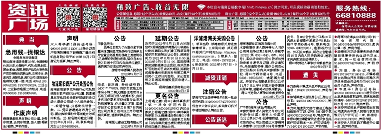 我司于2022年8月11日A06版发布《海南逸盛洋浦莲花山临港石化物流园码头改扩建工程项目海域使用权挂牌出让公告》,挂牌时间为2022年8月30日8:30至2022年9月9日11:00,现因疫情原因延期挂牌出让活动,相关交易环节的时间节点依次顺延,延期时间根据儋州市政府发布复工复产后两个工作日内告知。本公告发布之日起视同通知竞买申请人。特此公告。