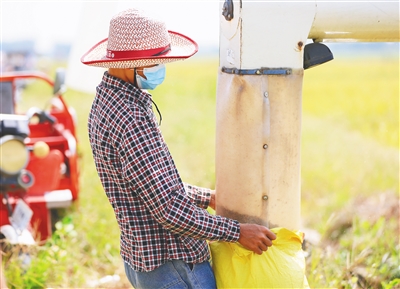 9月6日,定安县定城镇龙州洋种植基地,机械的轰鸣声传递出秋收的喜悦,一位农民用袋子在收割机的出谷口装稻谷。据了解,为做好抗疫情、保秋收工作,当地有关部门加强对收割人员的健康管理,减少人员聚集,根据水稻成熟情况组织收割机分批次为农户开展收割作业。本报记者 张茂 摄