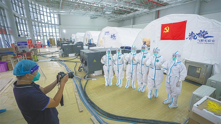 ② 杨师忠(左)在万宁市文化体育馆内的“凯旋号”气膜实验室拍摄。