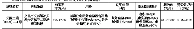 三、开发建设要求:(一)竞得土地后,竞得人须当场签订《成交确认书》,并在签订《成交确认书》后20个工作日内签订《国有建设用地使用权出让合同》,在签订《国有建设用地使用权出让合同》之日起30日内付清全部土地出让价款。(二)市场化商品住宅套型建筑面积不低于100平方米,实行全装修和采取装配式建筑的方式建造。(三)市场化商品住宅项目建设要严格按照《海南省人民政府关于加强新建住宅小区配套公共服务设施建设管理的意见》(琼府〔2017〕96号)要求,配套建设教育、医疗卫生、商业服务、文化体育等公共服务设施和水、电、路、气、光等“五网”基础设施。配套的基础设施和公共服务设施要与主体工程同步规划、同步建设、同步验收、同步交付使用。(四)本次宗地属城镇住宅商务金融混合用地,其中商务金融用地属高新技术产业项目。竞得该宗土地后,竞得人须严格按照批准的项目规划设计方案要求,以及有关部门的行业规定,在五个月内动工建设项目,两年内完成市场化商品住宅建设验收并达到房源交付条件,五年内全面完成整宗地块开发。不按批准的项目规划设计要求进行开发建设,以及不履行《国有建设用地使用权出让合同》约定的,报经市政府批准后,按该合同约定,退还除该合同约定的定金以外的全部或部分国有建设用地使用权出让价款(不计利息),收回国有建设用地使用权;受让人造成土地闲置,按照《海南自由贸易港闲置土地处置若干规定》执行。(五)本次出让宗地按净地条件出让,即土地权利清晰、安置补偿落实到位、地上附着物清表、无法律经济纠纷、土地开发利用规划条件明确、符合土壤环境质量要求、具备动工开发所必需条件。竞买人应当现场踏勘出让地块,竞买人申请参加竞买的,视为对出让地块净地条件无异议。(六)按照《关于印发<海南省建设用地出让控制指标(试行)>的通知》(琼国土资规〔2018〕7号)和《关于实施产业项目发展和用地准入协议的指导意见》(琼国土资规〔2018〕8号)有关规定,本次出让宗地城镇住宅项目用地控制指标,投资强度为不低于400万元/亩,不设定年度产值指标和年度税收指标,开发建设的项目产值和税收征缴按照现行有关法规政策规定执行,达产年限5年。以上控制指标按规定列入《产业项目发展和用地准入协议》,属于协议内容的组成部分,竞得人在签订国有土地使用权出让合同时,一并与文昌国际航天城管理局签订《产业项目发展和用地准入协议》。(七)竞得土地后,竞得人拟在文昌国际航天城起步区注册成立新公司进行开发建设的,须在竞买申请书中明确新公司的出资构成、成立时间等内容。(八)竞得土地后,竞得人须按规定完善该宗地施工报建、消防等审批手续,方可动工建设。(九)根据《文昌市住房和城乡建设局关于文国土储〔2022〕-54号地块建设项目装配式建造意见的复函》,该地块的竞得方应采用装配式方式建造。(十)该宗地市场化商品住房实行现房销售制度,按《商品房销售管理办法》(原建设部令第88号)有关规定执行,商务金融用地部分按《海南省自然资源和规划厅 海南省住房和城乡建设厅 海南省市场监督管理局关于加强商业、办公类建设项目全过程管理的意见》(琼自然资规〔2021〕12号)有关规定执行。