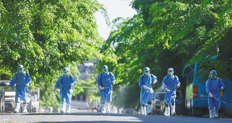 徐桂海和李娟虽是女将,但不怕苦、不怕累,干起活来,并不逊于男将。她们24小时待命,随时接到任务通知后立即进行消杀,做好日清日结。“不可能说我背不动了,活就不干了。队友们的任务也很重,大家都有一种心照不宣的坚守,‘轻伤不下火线’。因为一个人无法到岗,往往会给其他队员带来更大的工作负荷。”李娟说。