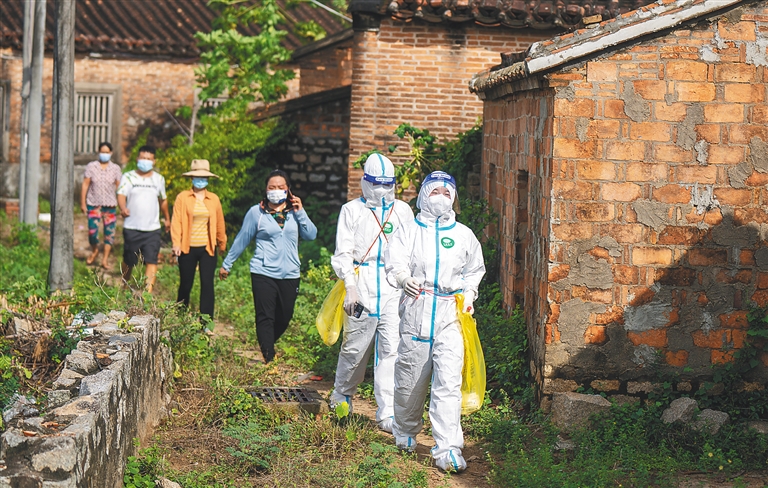 东澳镇的集丰村属于高风险区。陕西省渭南市大荔县8名医疗队员奔赴该村开展全员核酸采集工作。每天她们完成323户1723位村民的核酸采样工作后,浑身湿漉漉,衣服都能挤出水来,但她们没有一句怨言,更没有提出一丝要求。