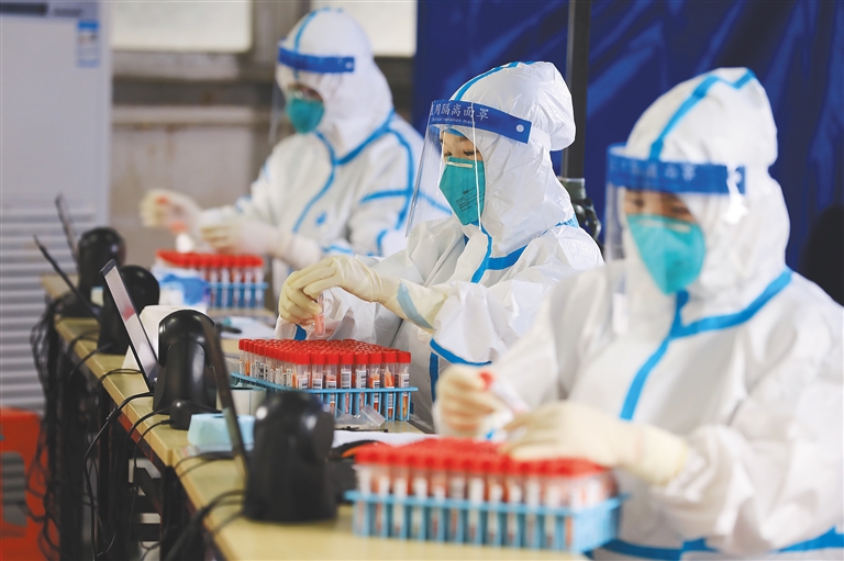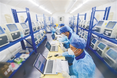 | 在援琼医疗队援建的定安硬气膜实验室中,工作人员在紧张开展检测工作。该实验室实行三班倒,24小时不间断运转。 程守满 摄 |