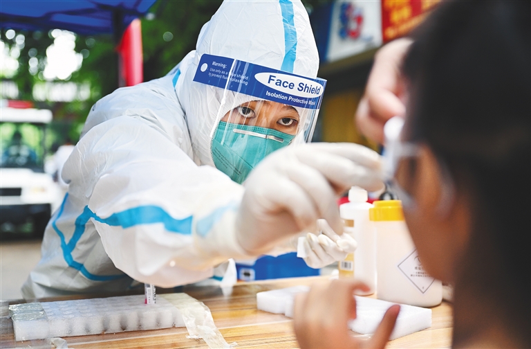 | 援琼医疗队核酸采集扫街队队员开展上门服务。 本报记者 陈元才 摄 |